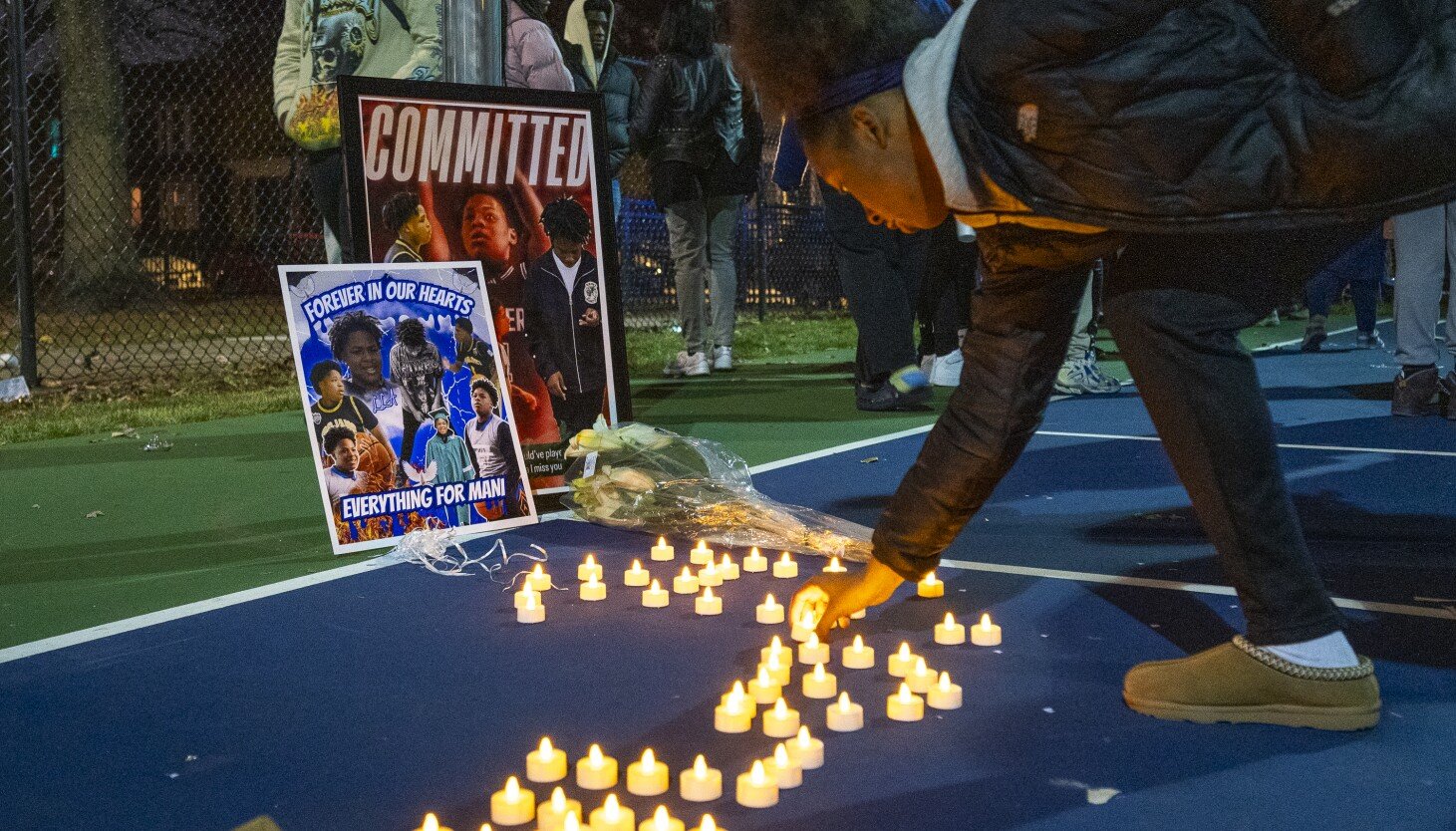A young woman adjusts a candle in a small vigil Monday for Armani Floyd in a basketball court near Gary Comer College Prep Middle School in Grand Crossing. Armani was shot and killed in the Loop Nov. 21 during a large gathering of teens.