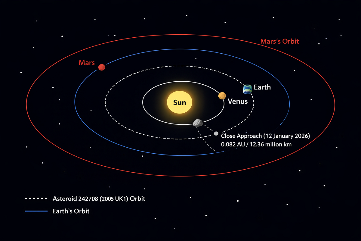 Obiekt bliski Ziemi klasy Apollo, napisany przez Asthroyzix Science News. Naciśnij klawisz Enter lub kliknij, aby wyświetlić obraz w pełnym rozmiarze. Ryc. 1. Orbita 242708 (2005 UK1) względem Ziemi i Słońca, pokazująca jej bliskie podejście w dniu 12 stycznia 2026 r. Streszczenie W artykule przedstawiono szczegółowy przegląd asteroidy 242708 (2005 UK1), bliskiej Ziemi klasy Apollo obiekt, który bezpiecznie zbliżył się do Ziemi w dniu 12 stycznia 2026 r. Artykuł podsumowuje jego odkrycie, charakterystykę orbity, szacunkowe rozmiary i status monitorowania, zapewniając kontekst dla badań obiektów bliskich Ziemi i wysiłków w zakresie obrony planetarnej. WprowadzenieAsteroida 242708 (2005 UK1) to dobrze śledzona asteroida bliską Ziemi klasy Apollo, odkryta po raz pierwszy 24 października 2005 r. przez Mount Lemmon Survey w Arizonie.Klasa Apollo asteroidy mają orbity przecinające orbitę Ziemi, co czyni je obiektami zainteresowania zarówno badań naukowych, jak i monitorowania obrony planetarnej.Odkrycie i klasyfikacjaOznaczenie: 242708Tymczasowa nazwa: 2005 UK1Data odkrycia…