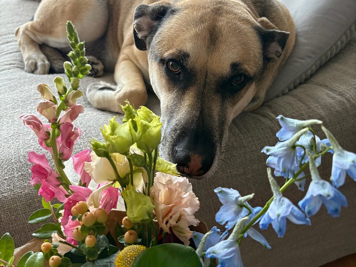 The teacher’s dog being offered flowers.