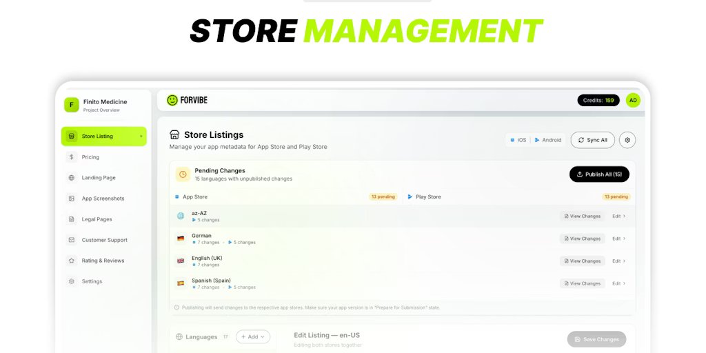Skoncentruj się na tworzeniu aplikacji mobilnej, a nie na pracy operacyjnej. Forvibe usprawnia cały proces uruchamiania App Store i Google Play. Automatyzujemy lokalizację, wykazy sklepów i generowanie zrzutów ekranu podczas obsługi stron docelowych AI, dokumentów prawnych i globalnych cen subskrypcji. Nie pozwól, aby tarcie podczas startu Cię spowolniło. Zajmujemy się podnoszeniem ciężkich ładunków, dzięki czemu możesz szybciej wysyłać produkty, skalować je na skalę globalną i skupiać się na tym, co naprawdę ważne: tworzeniu świetnego produktu.