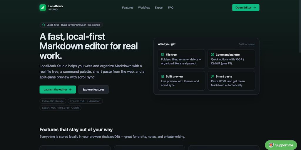 LocalMark Studio to pierwszy lokalny edytor Markdown zaprojektowany z myślą o szybkości i prywatności. Co jest tutaj specjalnego? Magazyn lokalny: Twoje notatki znajdują się w Twojej przeglądarce (IndexedDB). Prawdziwe drzewo plików: twórz foldery + pliki, zmieniaj nazwy, usuwaj. Paleta poleceń: naciśnij ⌘⇧P (Mac) / Ctrl⇧P (Windows/Linux). Inteligentne wklejanie: wklej bogaty kod HTML i uzyskaj czysty Markdown. Podgląd na żywo: podgląd w podzielonym panelu z synchronizacją przewijania. Dodatki: opcjonalne diagramy syreny + matematyka KaTeX.