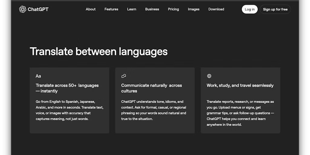 ChatGPT Translate to internetowe narzędzie do tłumaczenia AI, które natychmiast konwertuje tekst między ponad 50 językami, zachowując nienaruszone znaczenie, kontekst i ton. Możesz pisać, wklejać, mówić lub przesyłać dane wejściowe i uzyskać dopracowane tłumaczenia dostosowane do stylu formalnego, swobodnego lub innego. Został stworzony, aby pomóc w codziennej komunikacji, podróżach, nauce i zastosowaniach zawodowych.
