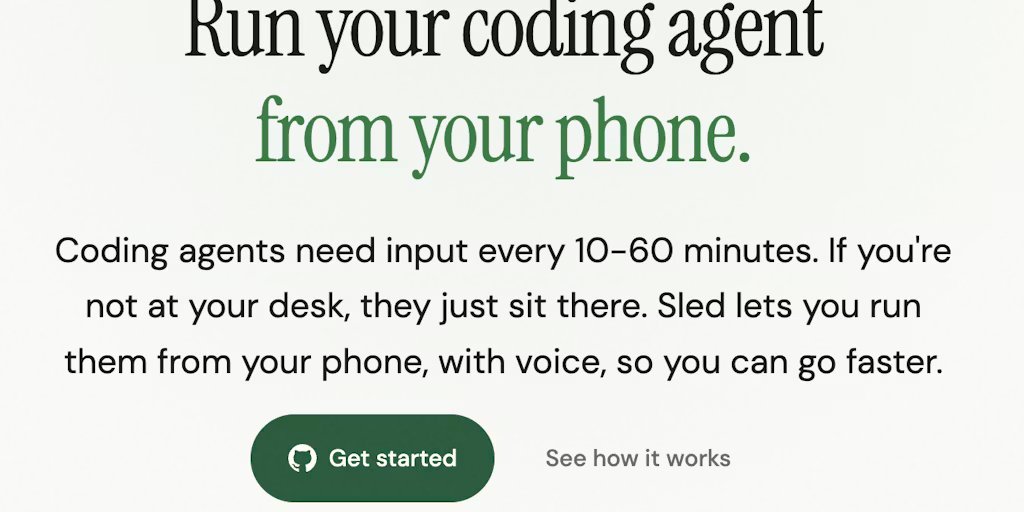 Sled pozwala uruchomić agenta kodującego z telefonu za pomocą głosu. Agenci kodujący potrzebują częstego wkładu, ale kiedy odchodzisz od biurka, po prostu siedzą bezczynnie. Sled rozwiązuje ten problem, udostępniając interfejs głosowy, który bezpiecznie łączy się z lokalnym agentem za pośrednictwem Tailscale. Twój kod nigdy nie opuszcza Twojej maszyny. Ty mówisz, agent pracuje lokalnie i słyszysz odczytany wynik. Współpracuje z Claude Code, OpenAI Codex i Gemini CLI. W pełni otwarte źródło.