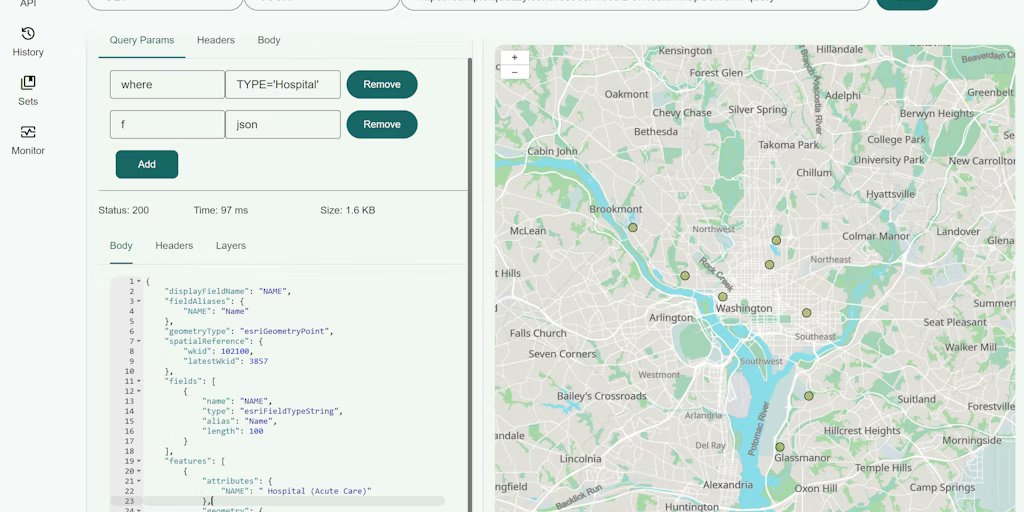 Quetzly pomaga programistom, zespołom GIS i IT testować, monitorować i wizualizować geoprzestrzenne interfejsy API. Wysyłaj żądania http, dostosowuj nagłówki i parametry zapytań oraz sprawdzaj JSON za pomocą zintegrowanego edytora. Renderuj usługi WMS, WFS, GeoJSON i ArcGIS na interaktywnej mapie, przełączaj warstwy, powiększaj zakresy i eksportuj dane jako GeoJSON lub Shapefile. Śledź stan punktów końcowych, aby skrócić przestoje i zapewnić niezawodność usług lokalizacyjnych. Quetzly jest obecnie w otwartej wersji beta. Wypróbuj za darmo.