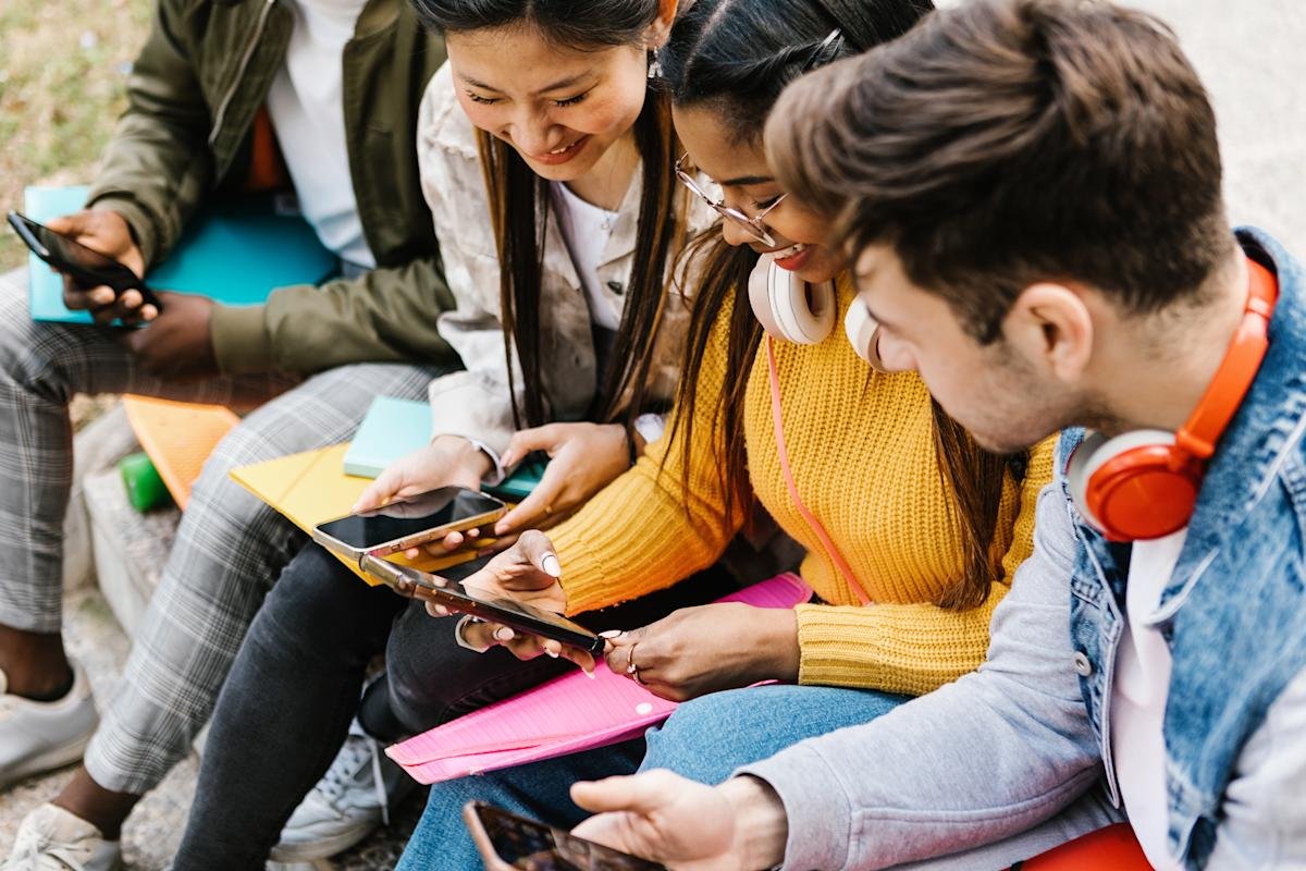 Diverse young teenage students having fun using mobile phone in college campus - Education, millennial people and social media concept (Xavier Lorenzo via Getty Images)