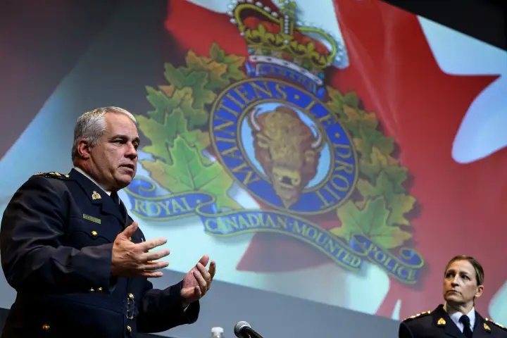 RCMP Commissioner Mike Duheme, left, speaks at news conference with Assistant Commissioner Brigitte Gauvin, right, RCMP National Headquarters, Ottawa, Oct. 14, 2024. THE CANADIAN PRESS/Justin Tang.