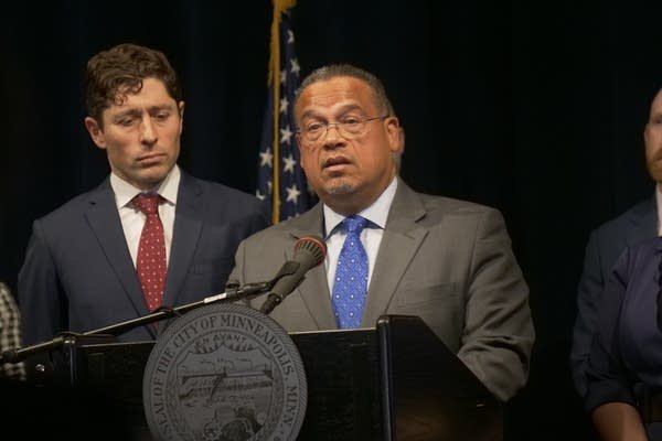Minnesota Attorney General Keith Ellison speaks during a press conference in Minneapolis Monday.