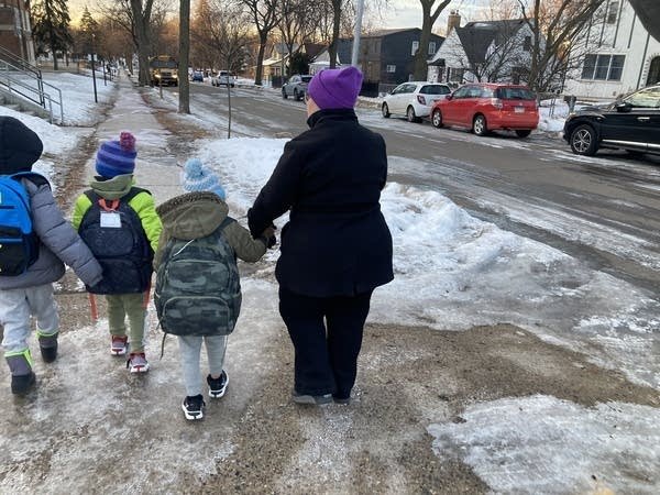 A parent in Minneapolis escorts two neighbor children to school on Jan. 15 in Minneapolis.