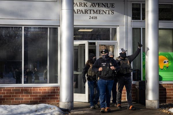 An ICE officers flashes a thumbs up as they exit an apartment complex on Park Avenue in south Minneapolis during operations on Tuesday.