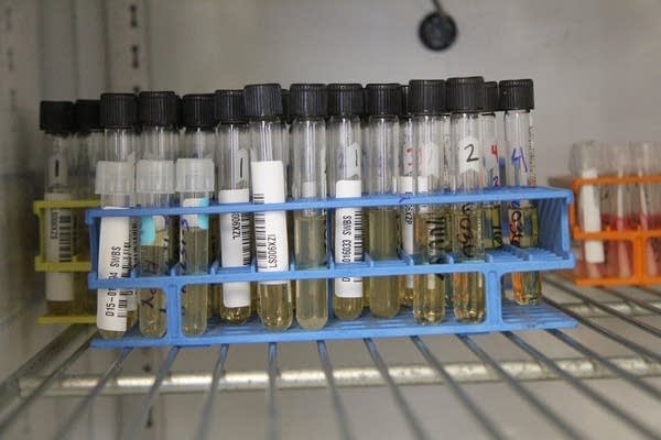 Refrigerated Avian influenza testing samples sit at the Veterinary Diagnostics Lab on April 8, 2015.